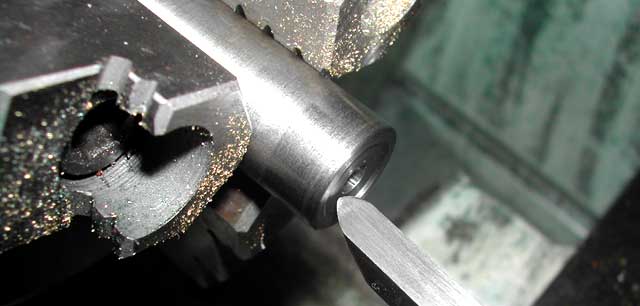 | This is the most commonly requested service. The barrel gets mounted in the lathe with a live center in the muzzle. The muzzle gets turned down to the required size and then threads are cut with a single point tool. This ensures that the threads will be perfectly concentric and parallel to the bore. After the threads are done and deburred, a new crown is cut to eliminate the damage caused by the live center. Other shops would consider this a 'precision' threading job. I do 1/2-28 threads as standard. For other thread specifications, select the "precision threading" option and specify the threads in the comments box of the order form. The threaded area will be left unfinished. Picture | |